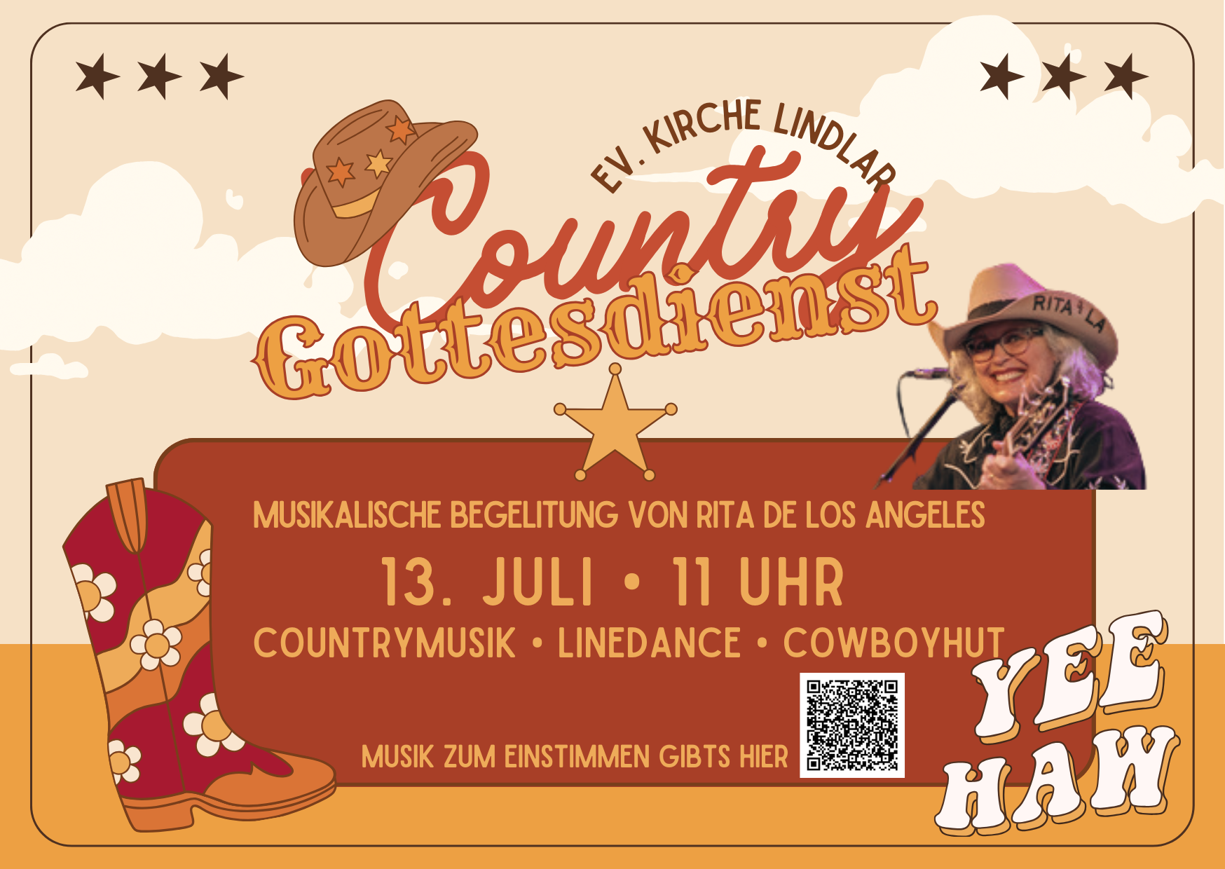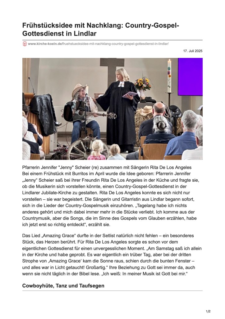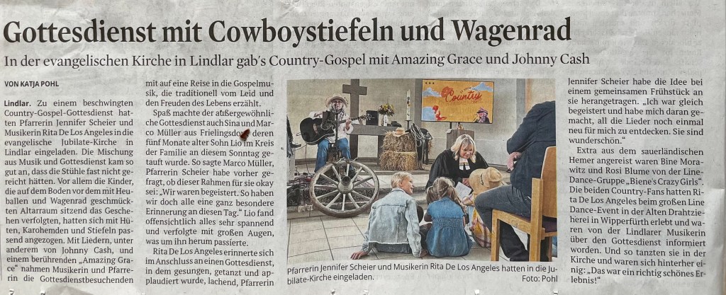 Ich biete ein Country-Gospel-Programm, das ein einzigartiges musikalisches Angebot für Ihre Gemeinde darstellen kann. Dieses zehn Lieder umfassende Programm habe ich bereits in der Evangelischen Kirche in Lindlar (Oberbergischer Kreis) aufgeführt – und die Resonanz war überwältigend: Die Kirche war so gut besucht wie an Weihnachten. Gäste reisten bis zu 90 Minuten an, um dieses besondere Erlebnis mitzuerleben. Als Überraschungsgäste war sogar die Linedance-Gruppe Hemer anwesend und tanzte zu ausgewählten Country-Gospel-Stücken von Johnny Cash und Dolly Parton.